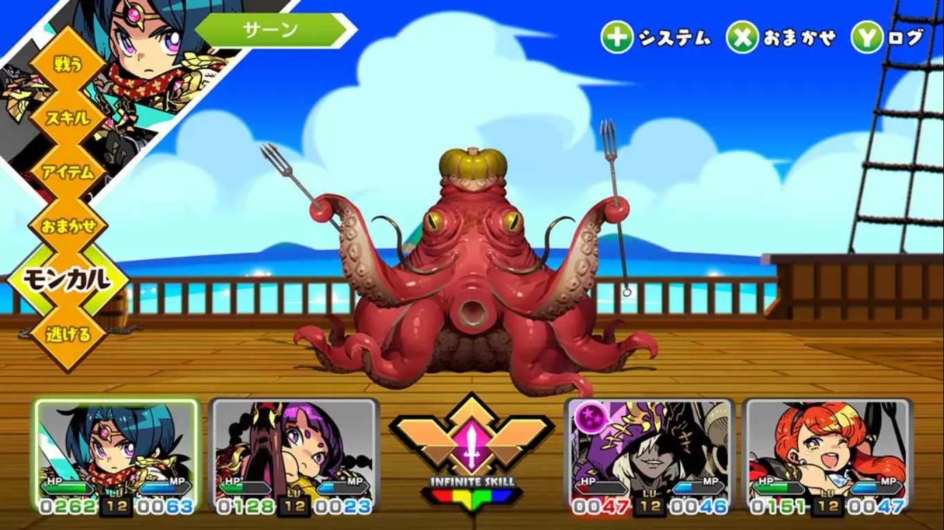 指令战斗与职业搭配:游戏采用经典的回合制指令战斗。除了不可转职的“勇者”外,玩家可以招募 3 名同伴,从战士、骑士、武斗家、僧侣、魔法师、盗贼以及特殊的“小丑”共 7 种职业中进行自由组合。其中“小丑”职业拥有类似“帕尔普恩特”的随机效果魔法,为战斗增添了极大的不确定性和趣味性。